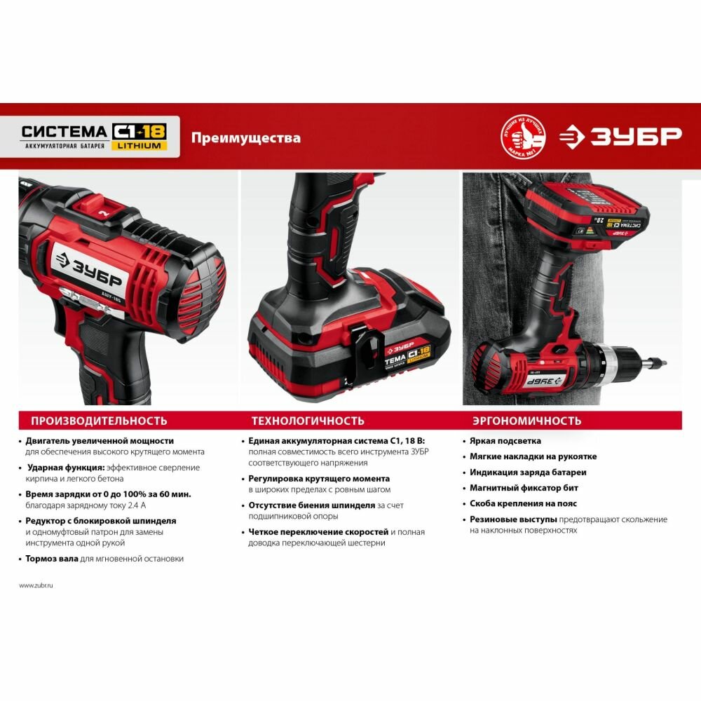 ЗУБР С1-18, 18 В, 40 Нм, 2 АКБ (2 Ач), ударная дрель-шуруповерт, кейс (ДШУ-185-22)