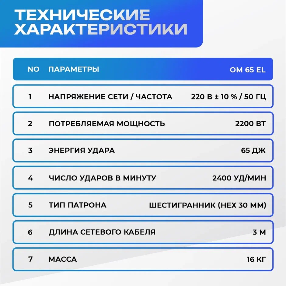 | Макс. энергия удара | 65 Дж |