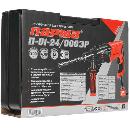 Перфоратор парма П-01-24/900ЭР [02.027.00003] { 900Вт,3-х реж,2,6Дж,SDS-plus, рег.об.,рев, пл.пуск,рук.Эрго+)(5ш/к) }