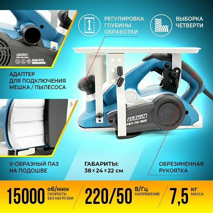 Рубанок электрический варяг РЭП-110/1600 переворотный/ электрорубанок 1600Вт, 15000 об/мин, выборка четверти, регулировка глубины строгания