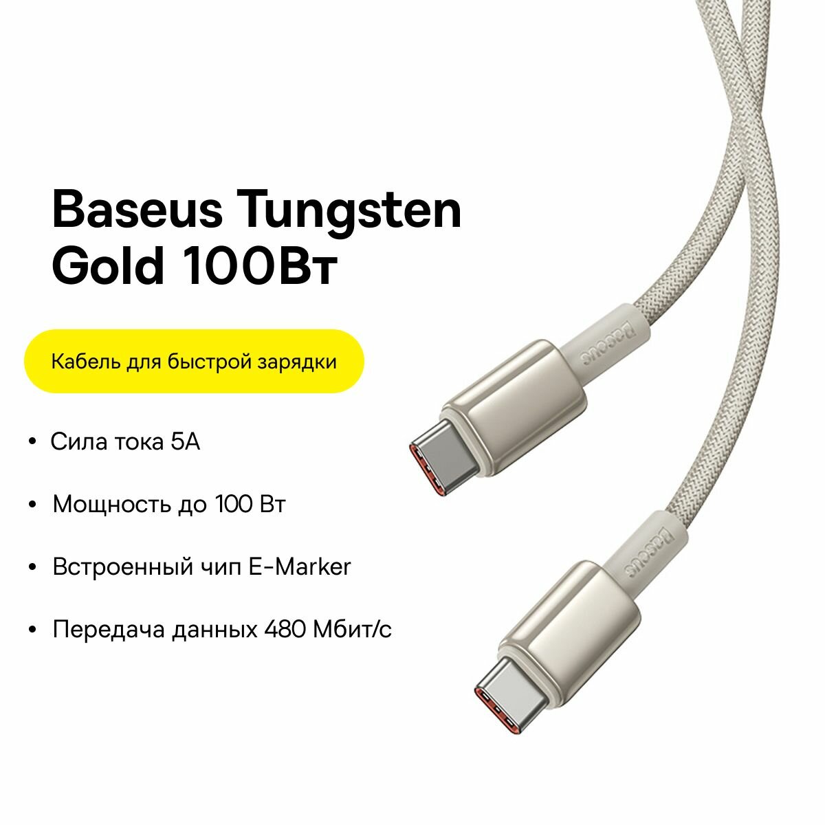 Дата-кабель BASEUS Tungsten Gold USB-C->Type-C с функцией быстрой зарядки 100W 2м золотой