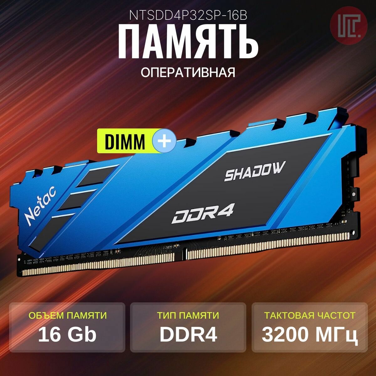DDR4 16Gb Netac PC25600, 3200Mhz, Shadow NTSDD4P32SP-16B C16 Blue, с радиатором