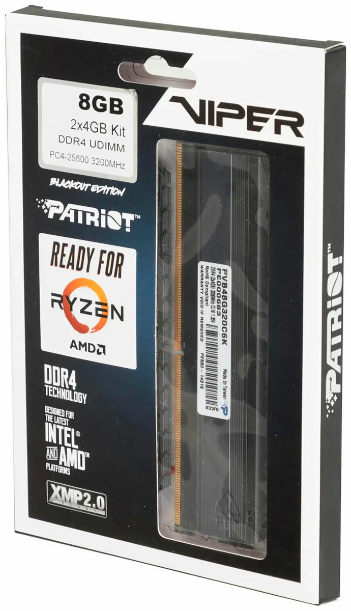 Оперативная память Patriot Viper 4 Blackout DDR4 - 2x 4GB, 3200 МГц, DIMM, CL16, RTL (pvb48g320c6k)