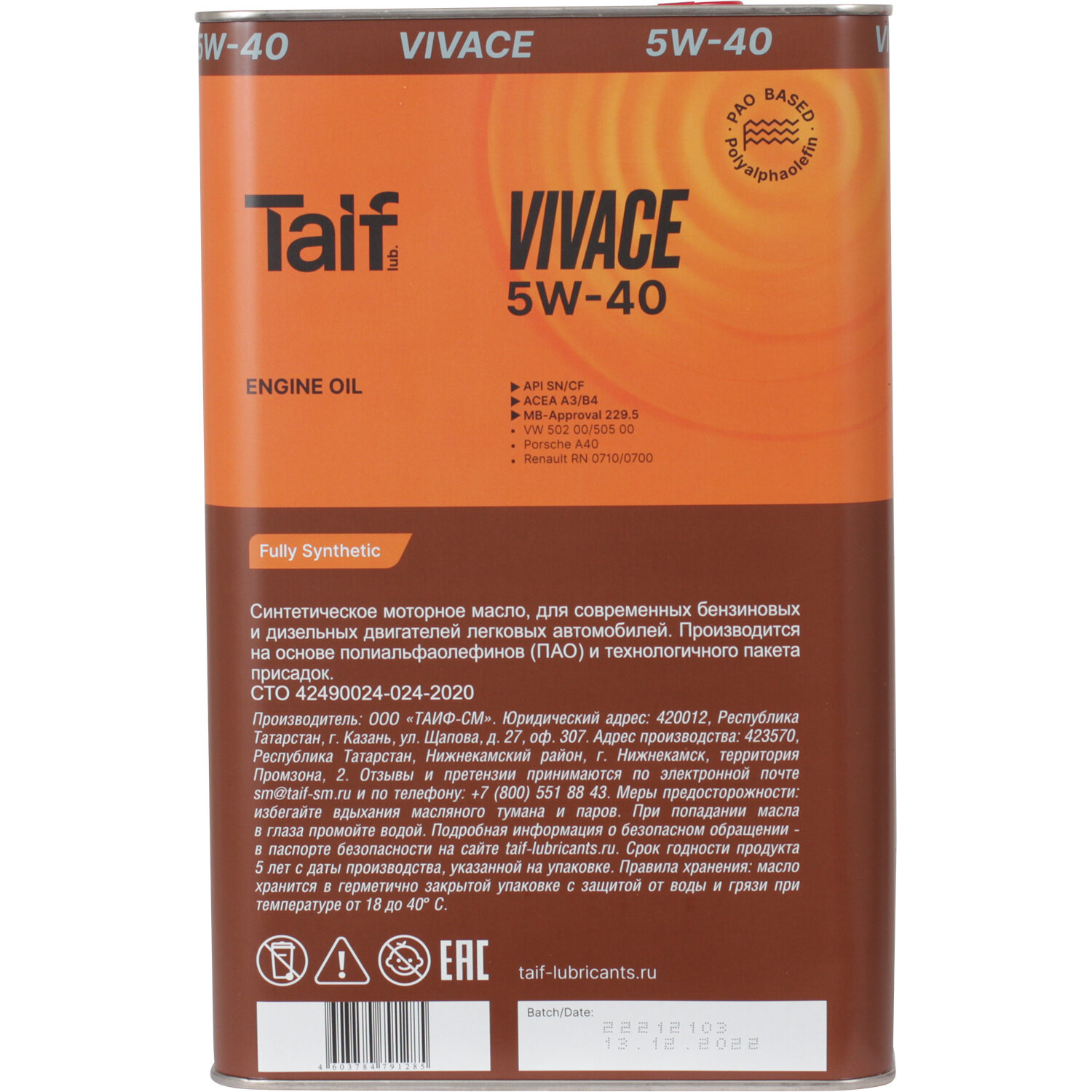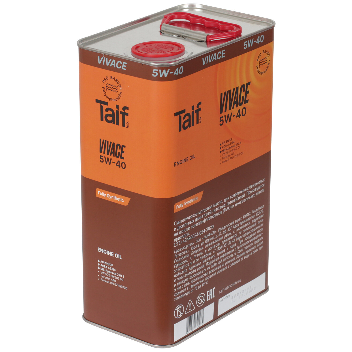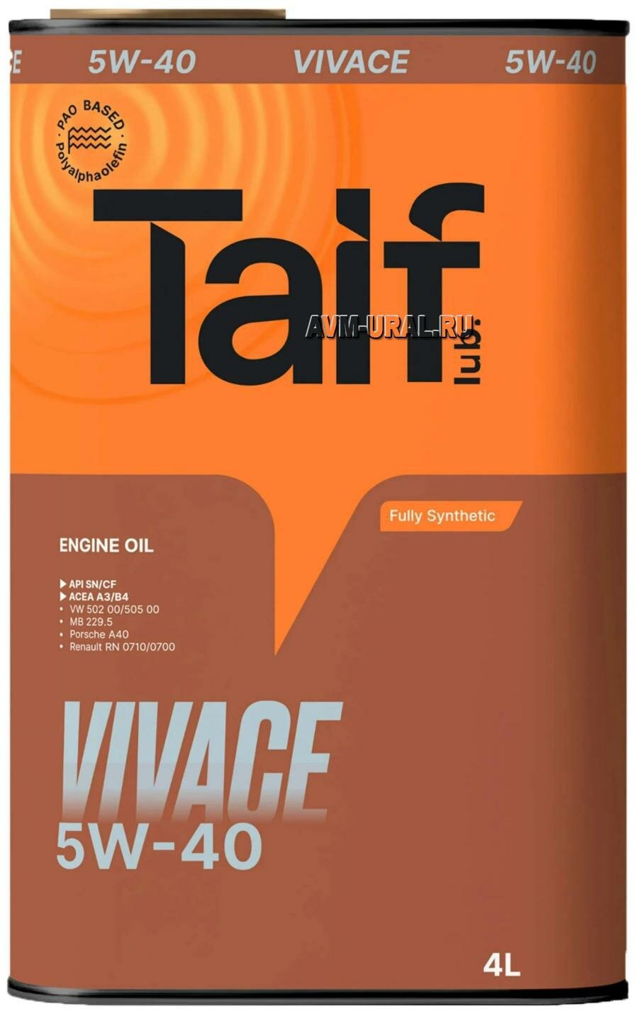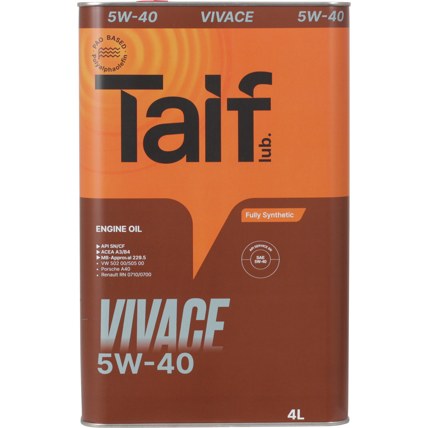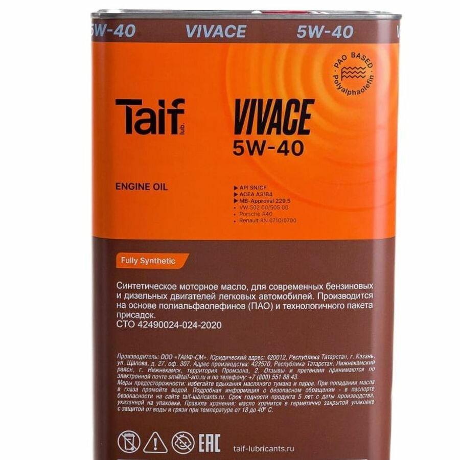 Синтетическое моторное масло TAIF VIVACE SN/CF 5W-40, 4 л, 3.8 кг, 1 шт
