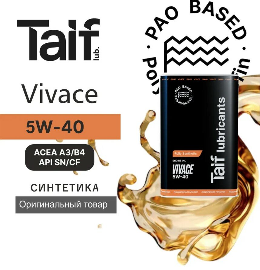 Моторное масло TAIF VIVACE 5W-40 Синтетическое, ПАО, A3/B4, SN/CF, 4 л