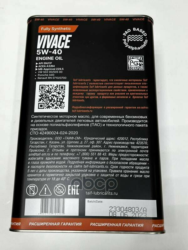 Моторное масло TAIF VIVACE 5W-40 Синтетическое, ПАО, A3/B4, SN/CF, 1 л