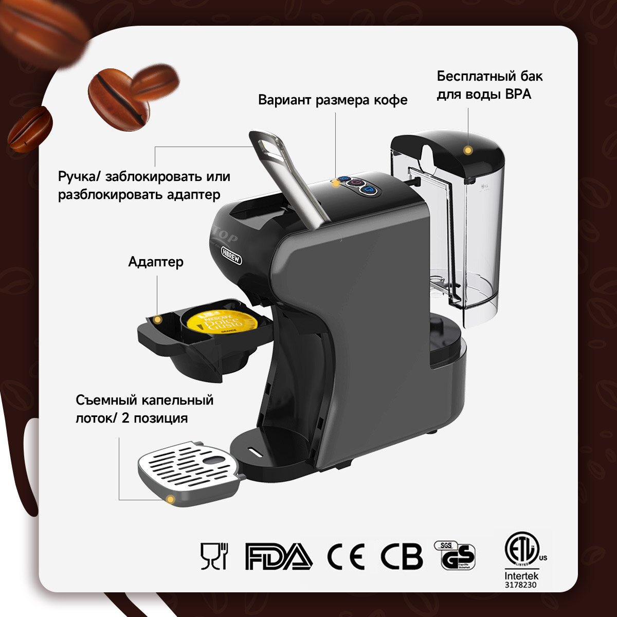| Тип капсул | Nespresso Original / Dolce Gusto |