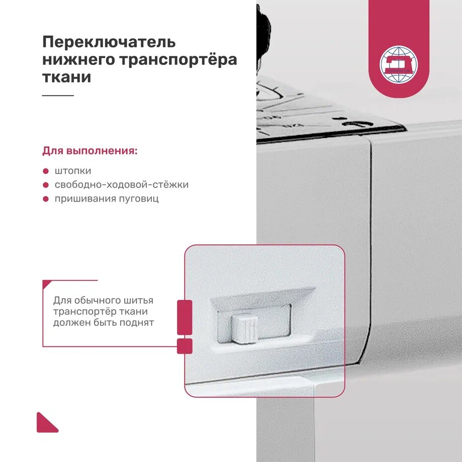 | Строчки | обметочная, потайная, эластичная, эластичная потайная, «зигзаг» |