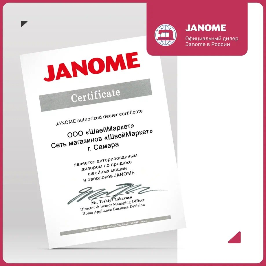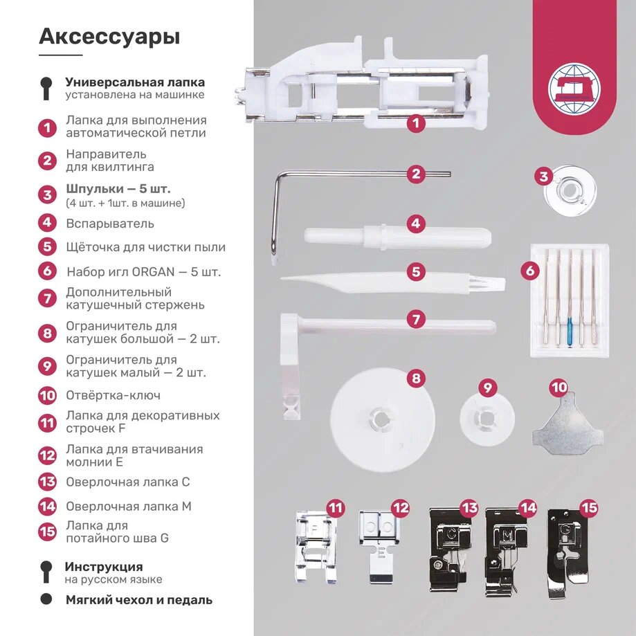 | Комплектация | швейная машина, лапка стандартная A, лапка для втачивания молнии Е, рамка для автоматического выполнения петли R, оверлочная лапка C, оверлочная лапка М, лапка для потайного шва G, лапка для декоративных строчек F, направитель для квилтинга, шпульки 4 шт., набор игл Organ - 5 шт., вспарыватель, отвертка-ключ, щёточка от пыли, дополнительный горизонтальный катушечный стержень, ограничитель для катушек малый – 2 шт., ограничитель для катушек большой – 2 шт., жесткий чехол |