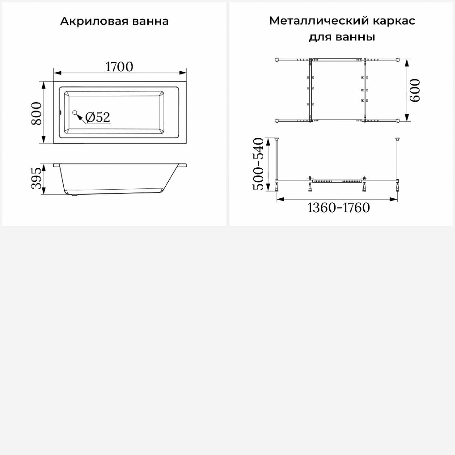 Акриловая ванна 170х80 см Lavinia Boho Element набор 2 в 1 S1-37090080: прямоугольная ванна, усиленный металлический каркас