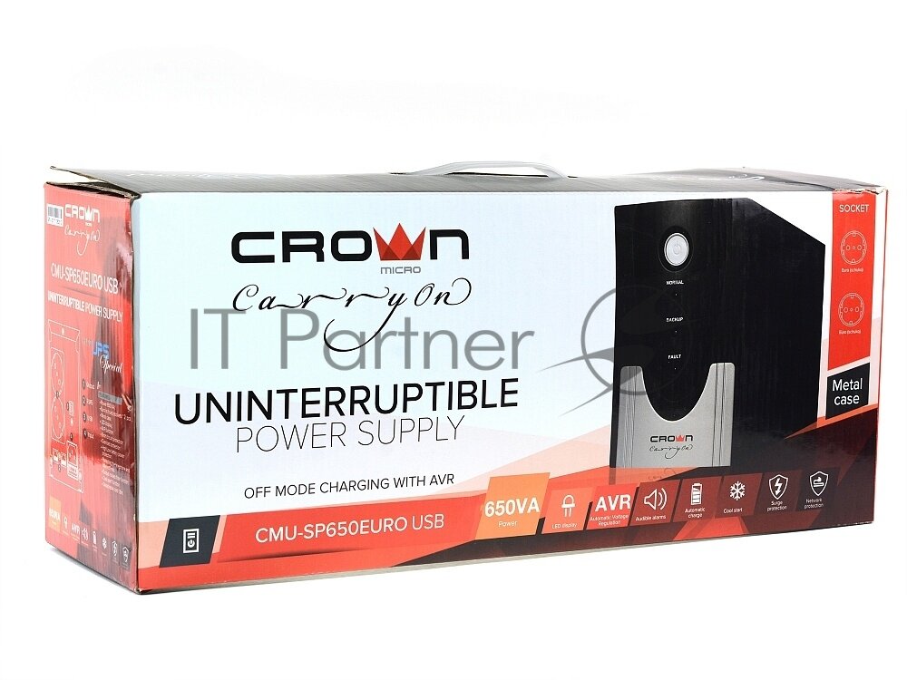 Источник бесперебойного питания CROWN CMU-SP650EURO LCD USB (650VA/390W, корпус металл, 1x12V/7AH, выходные розетки 2*EURO, трансформатор AVR 140-290V, cъёмный кабель 1.8 м, порт RJ-11/45, порт USB, LCD-экран, защита батареи от полного разряда, от пе