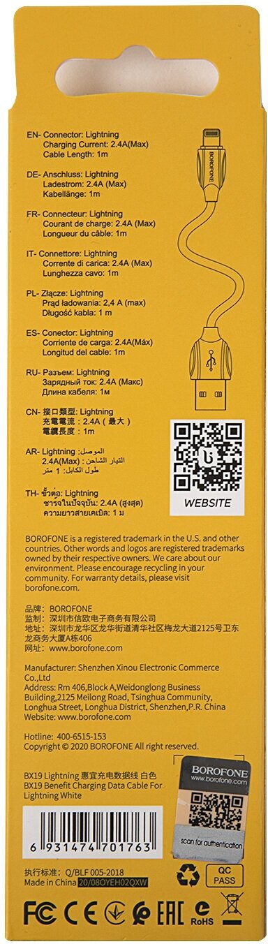 Кабель BOROFONE BX19 Benefit, USB - Lightning, 1 м, 1 шт., белый