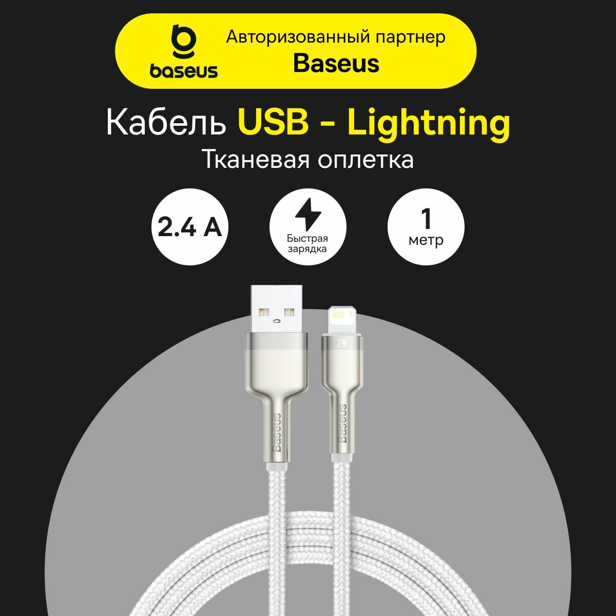 Кабель для айфон USB BASEUS Cafule Series Metal USB - Lightning, 2.4А, 12W, 1 м, белый