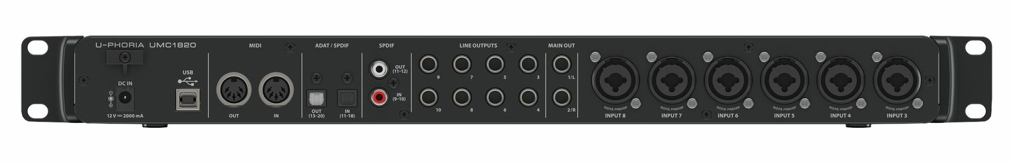 Behringer UMC1820 внешний звуковой/MIDI интерфейс, USB 2.0 ,18 вх/20 вых канала, 24бит/96кГц, предусилители MIDAS, MIDI I/O, ADAT I/O, S/PDIF I/O