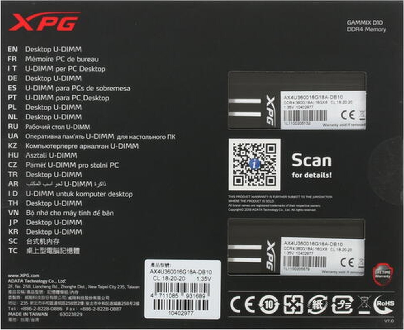 Оперативная память XPG Gammix D10 32 ГБ (16 ГБ x 2 шт.) DDR4 3200 МГц DIMM CL16 AX4U320016G16A-DB10
