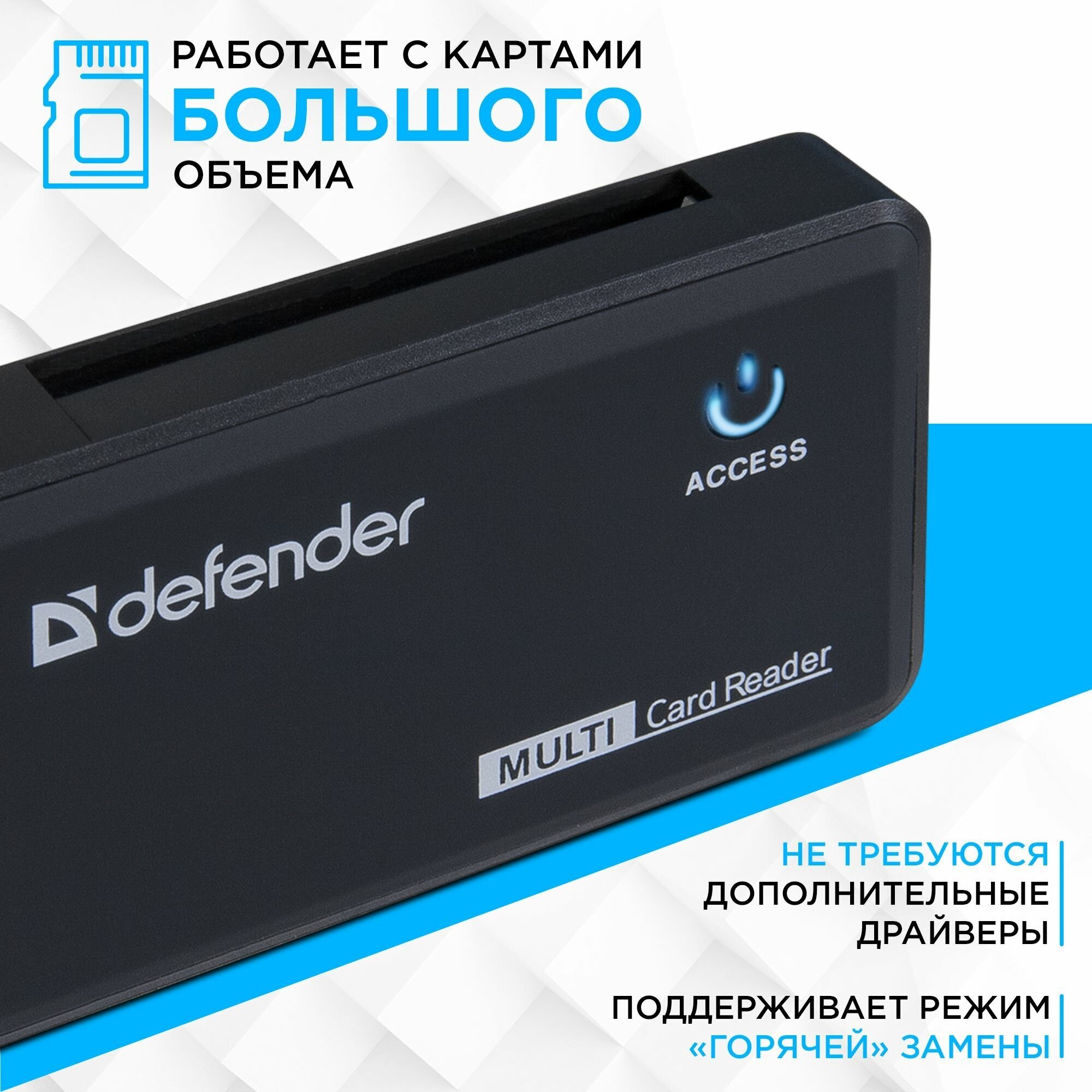 Картридер DEFENDER OPTIMUS USB 2.0, порты SD/MMC, TF, M2, MC, CF, XD, 83501