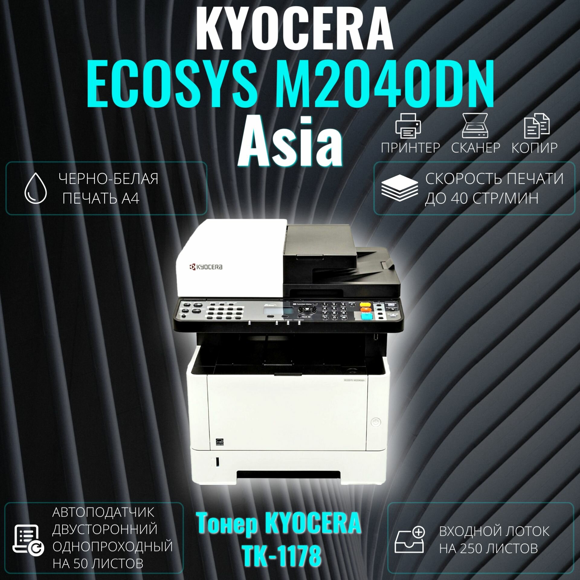 МФУ лазерное Kyocera ECOSYS M2040DN черно-белая печать А4. Азиатская версия (1102S33AX0), тонер TK-1178