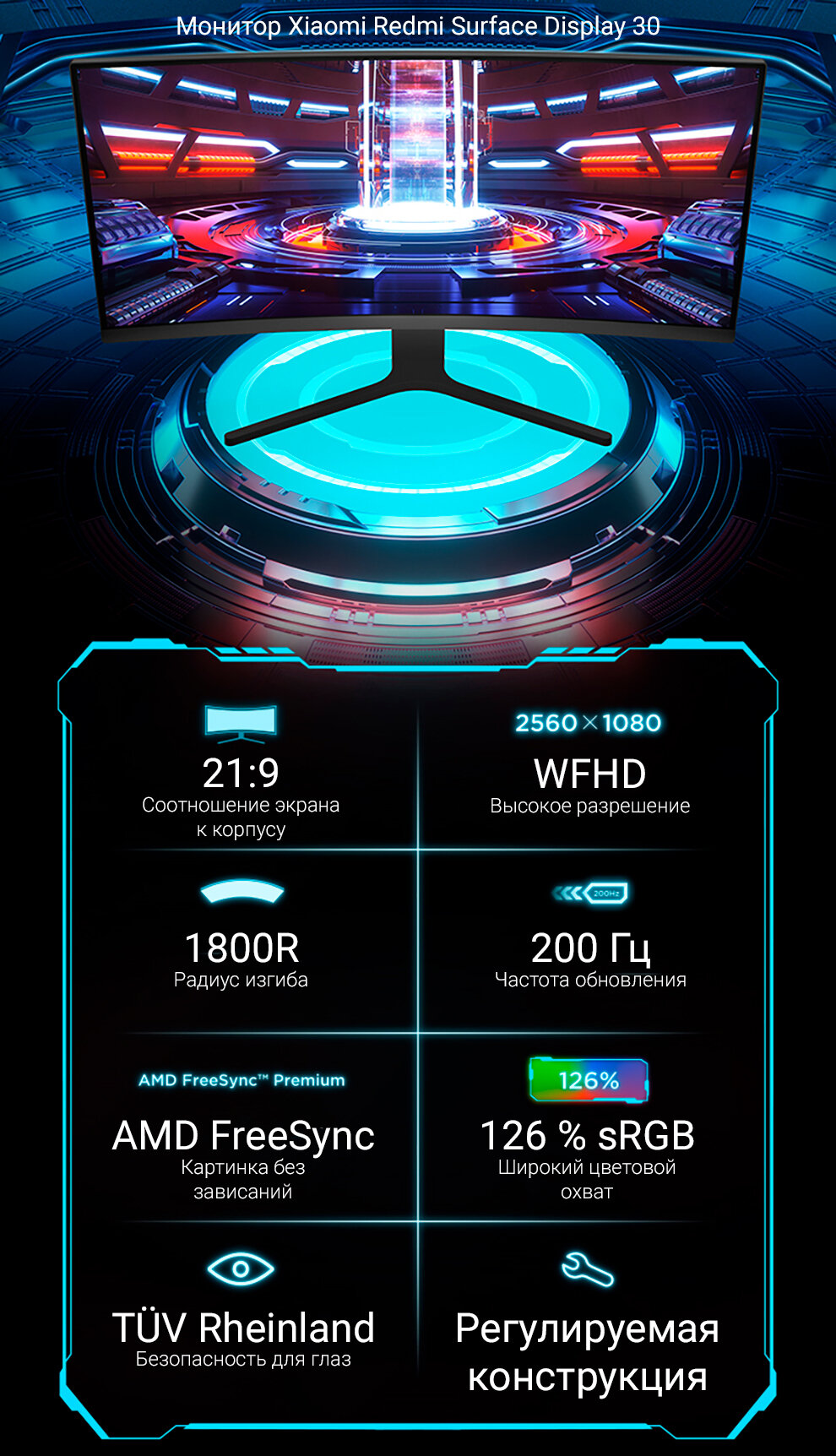 Монитор Xiaomi 30" Curved Gaming Monitor VA 2560x1080 200hz 4ms 21:9 3000:1 300cd FreeSync(Prem) 2x .