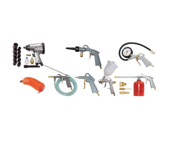 | Дополнительная информация | в комплекте пескоструйный пистолет с шлангом, ударный пневмогайковерт, 10 головок для пневмогайковерта, пневмопистолет для накачки шин с манометром, краскораспылитель с верхним бачком на 0,5 л, пневмопистолет для вязких жидкостей с бачком, комплект из трех наконечников, пневмопистолет для продувки или мойки, пневмопистолет для продувки, гибкий спиральный шланг длиной 5 м с быстроразъемными соединениями |