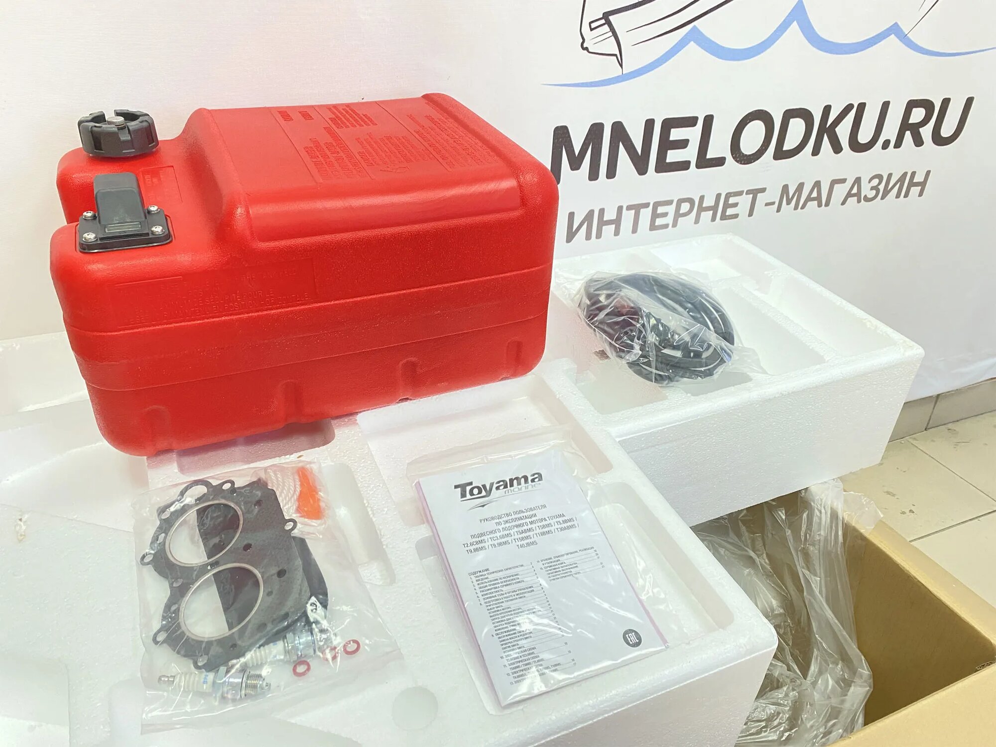 | Комплектация | инструкция по эксплуатации; выносной топливный бак на 12 л, с топливным шлангом; прокладка сливного винта редуктора 3 шт.; прокладка головки блока цилиндров 1 шт.; свеча зажигания BPR7HS 2 шт.; трос аварийного запуска; чека; шплинт φ2.5×20; отвертка; свечной ключ; мешочек для инструментов |