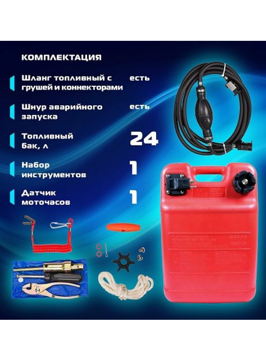 | Комплектация | - топливный шланг с грушей и коннекторами; - шнур аварийного запуска; - топливный бак; - датчик моточасов; - набор инструментов; - руководство пользователя. |