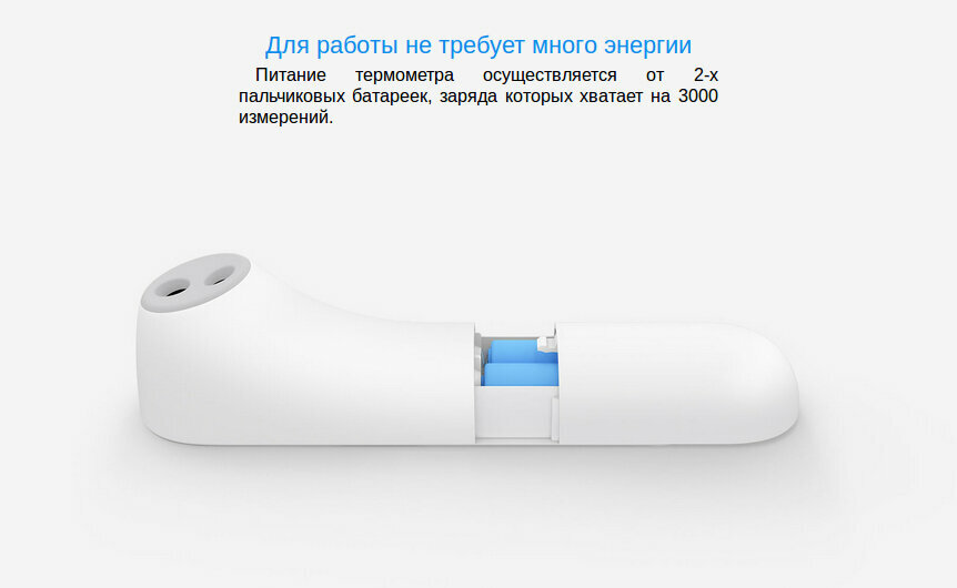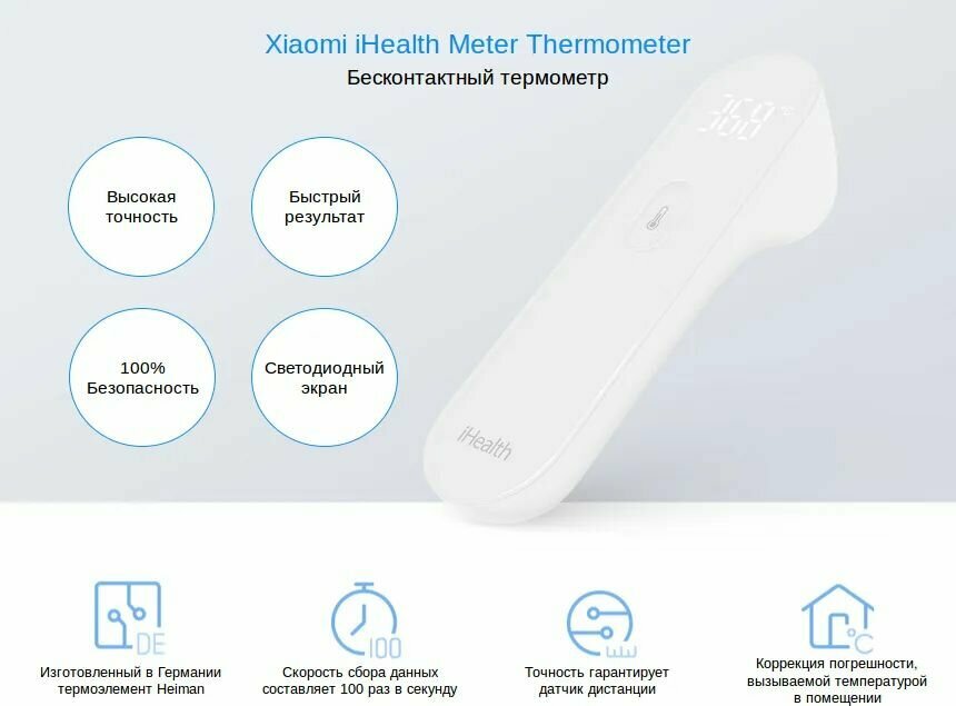 | Дополнительная информация | Данная модель градусника оснащена температурным датчиком, изготовленным немецкой фирмой Heimann. Этот сенсор с предельно возможной точностью засекает тепловое излучение, которое испускает человеческое тело. После нажатия кнопки механизм Xiaomi iHealth замеряет этот спектр сто раз в секунду, после чего пропускает информацию через специальный алгоритм, формирующий конечное значение. |