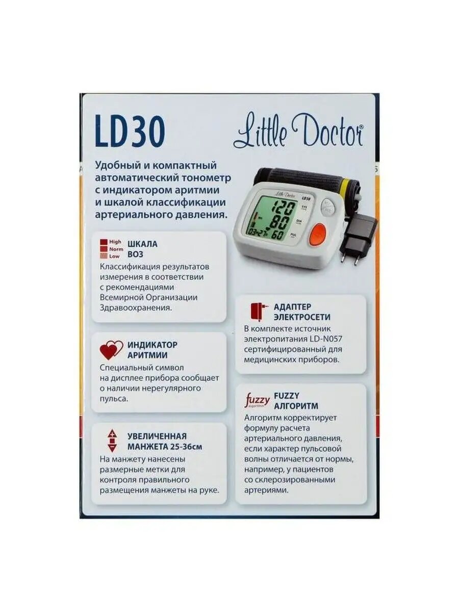 Little Doctor LD30 / Литтл Доктор - автоматический тонометр на плечо с адаптером, увеличенным дисплеем и индикатором аритмии