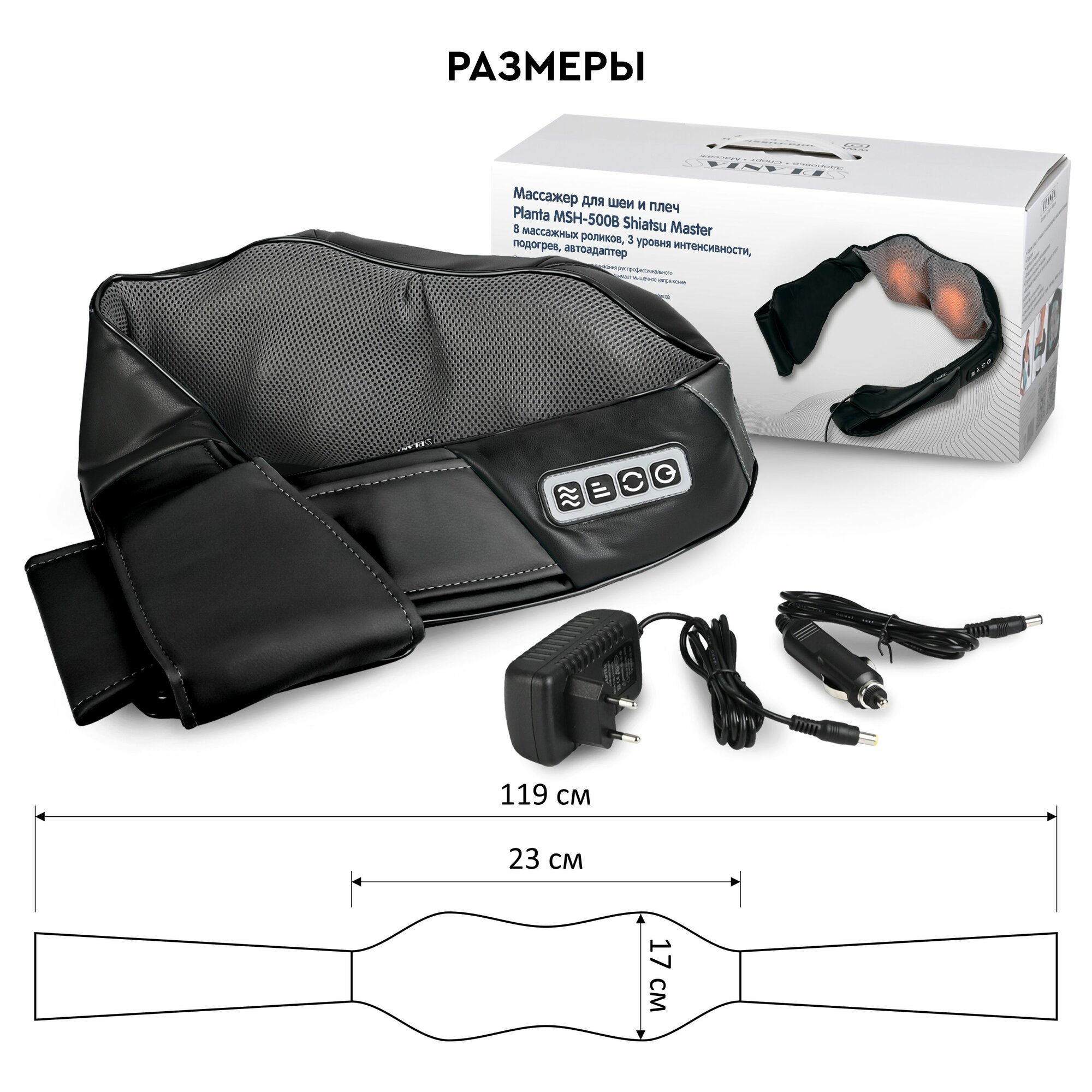 PLANTA Массажер для шеи и плеч MSH-500B Shiatsu Master, 8 роликов, 3 уровня интенсивности, подогрев с подсветкой, таймер, перкуссионный разминающий массажер, адаптер для автомобиля интересное: