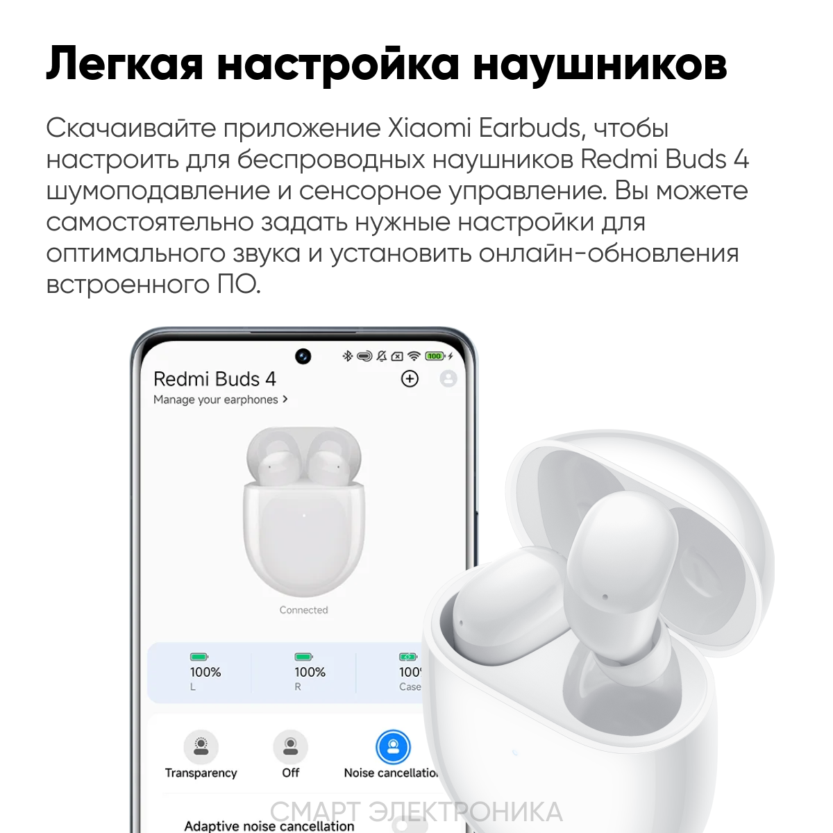 Наушники Redmi Buds 4 (BHR5846GL), шумоподавление, 48/490 мАч, BT 5.2, белые