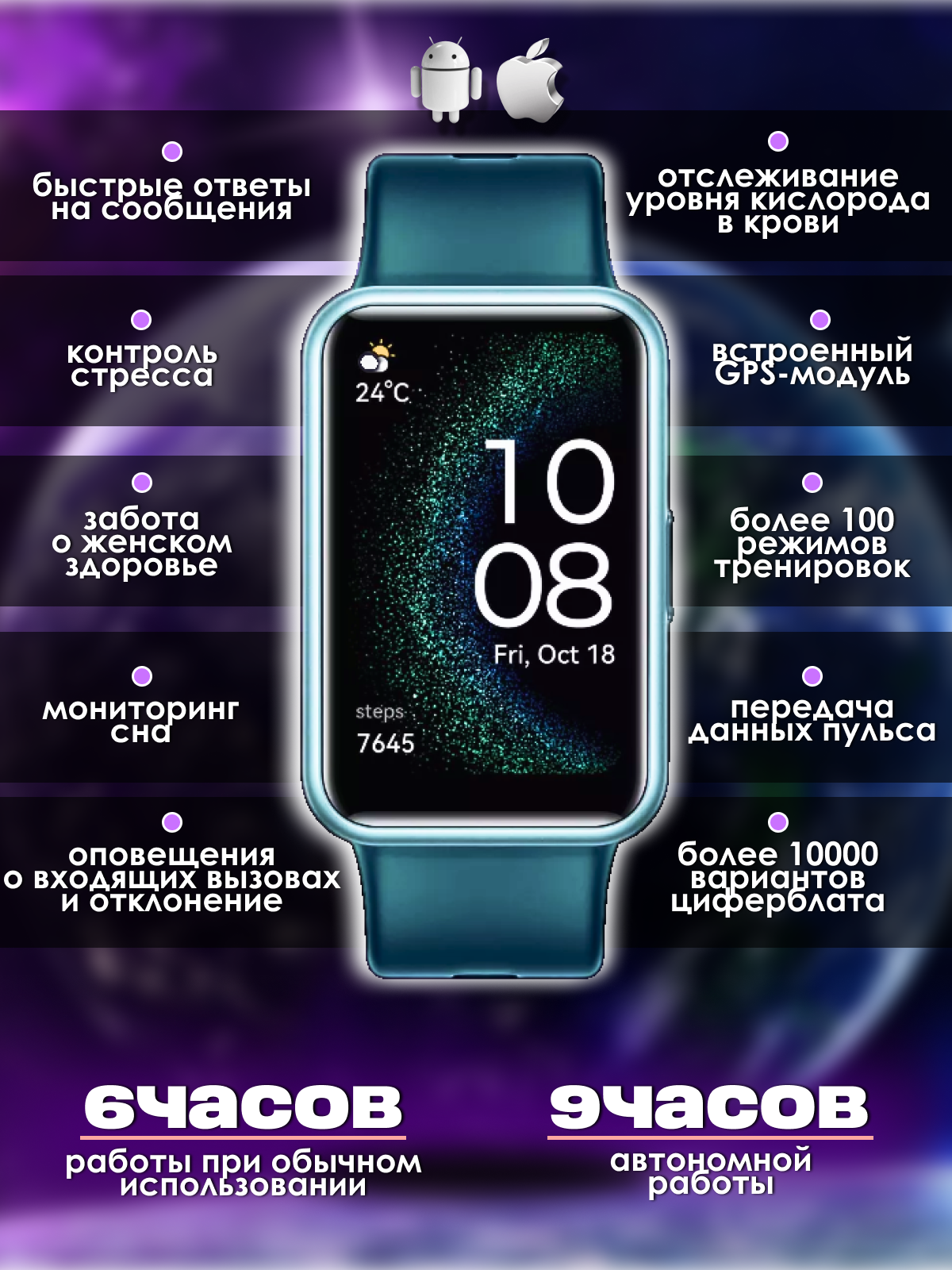 | Функции мониторинга | измерение уровня кислорода в крови / постоянное измерение пульса / мониторинг сна / акселерометр |