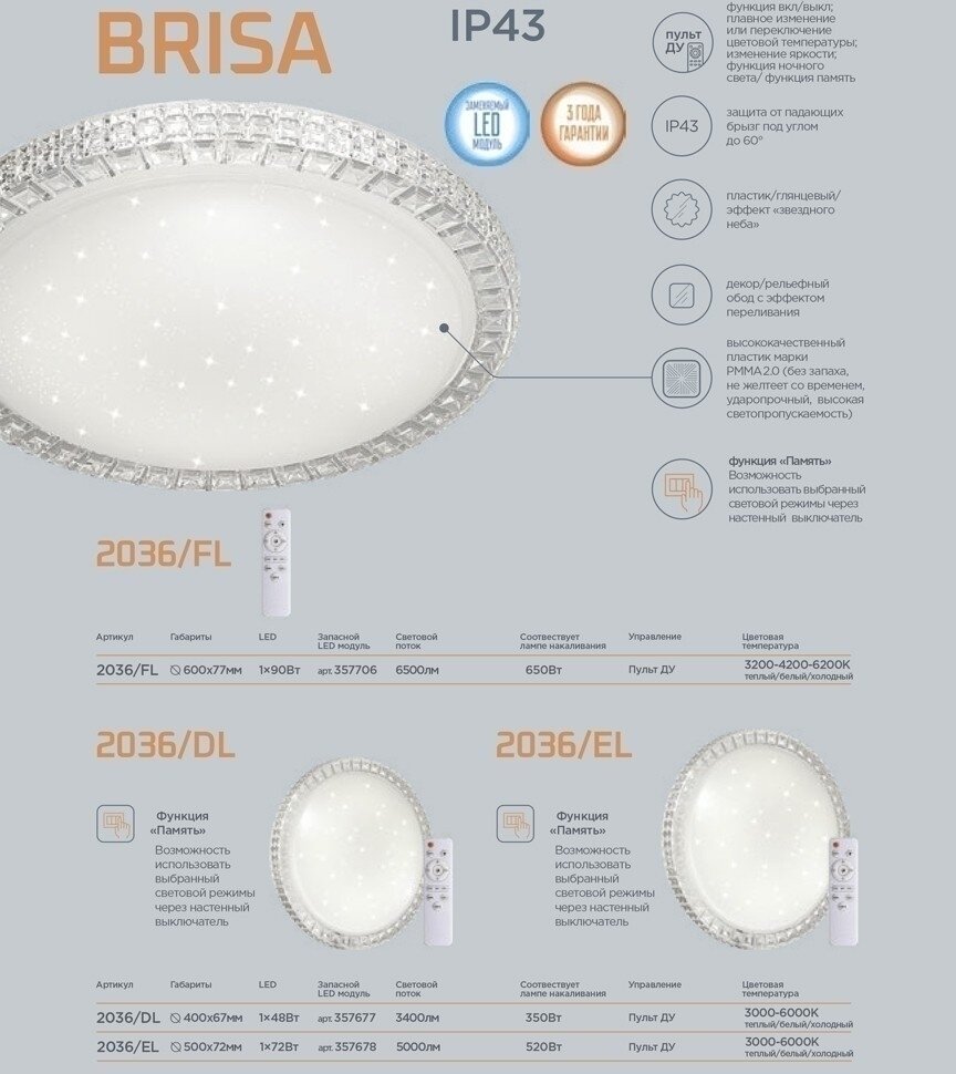 Потолочный светодиодный светильник с пультом ДУ Brisa 2036/DL