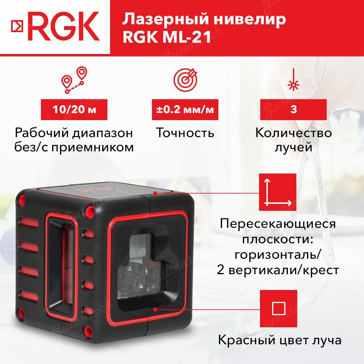 Нивелир лазерн. RGK ML-21 2кл.лаз. 635нм цв.луч. красный 3луч. (4610011871788)