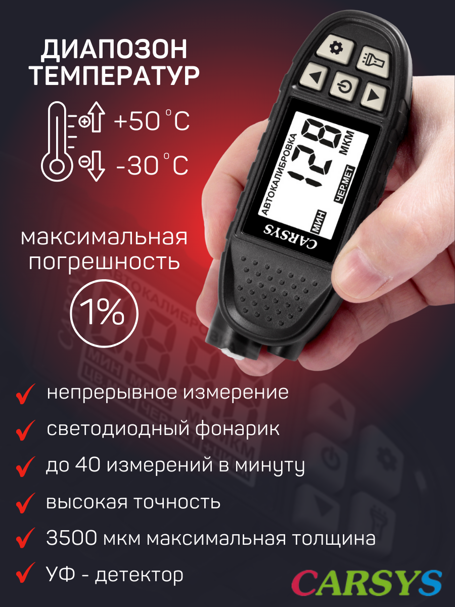 Толщиномер CARSYS автоподбор с противоударным чехлом, Al/Fe + Цинк, фонарик + УФ до 3500 мкм
