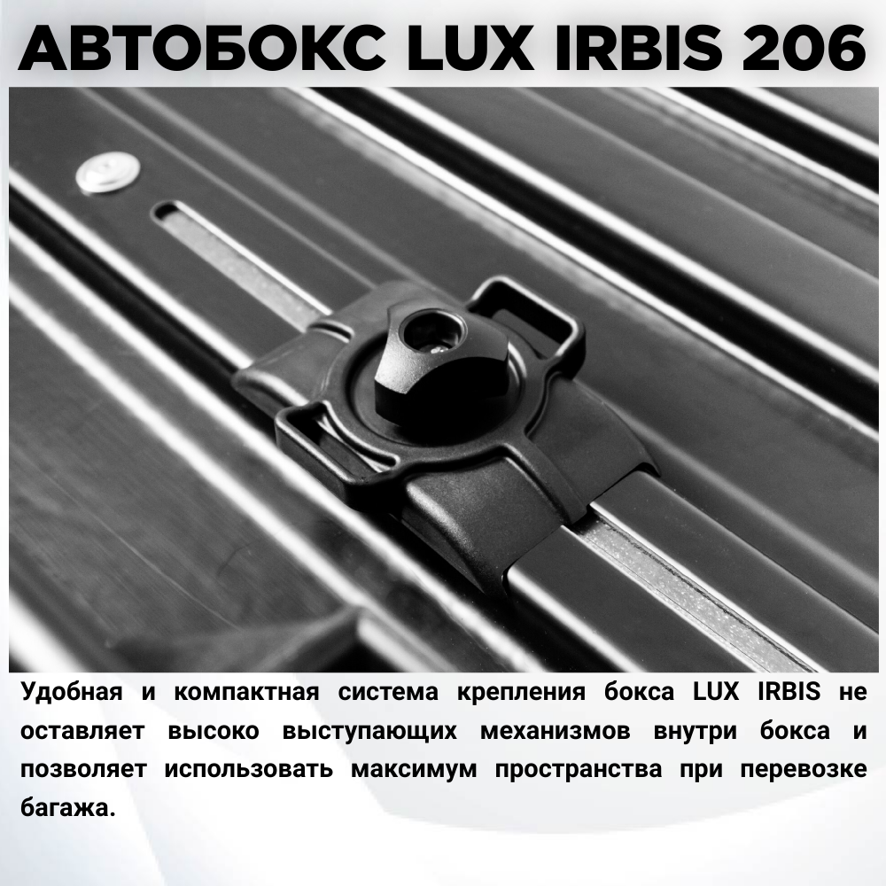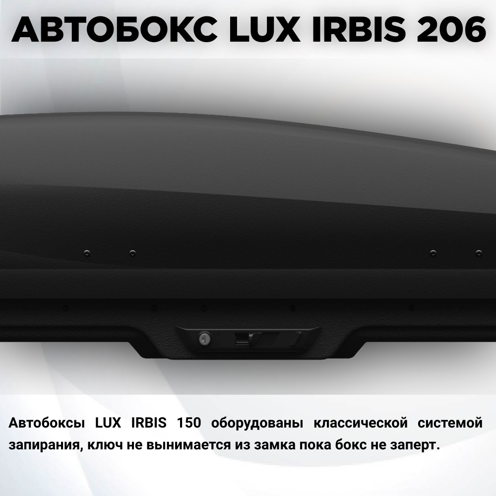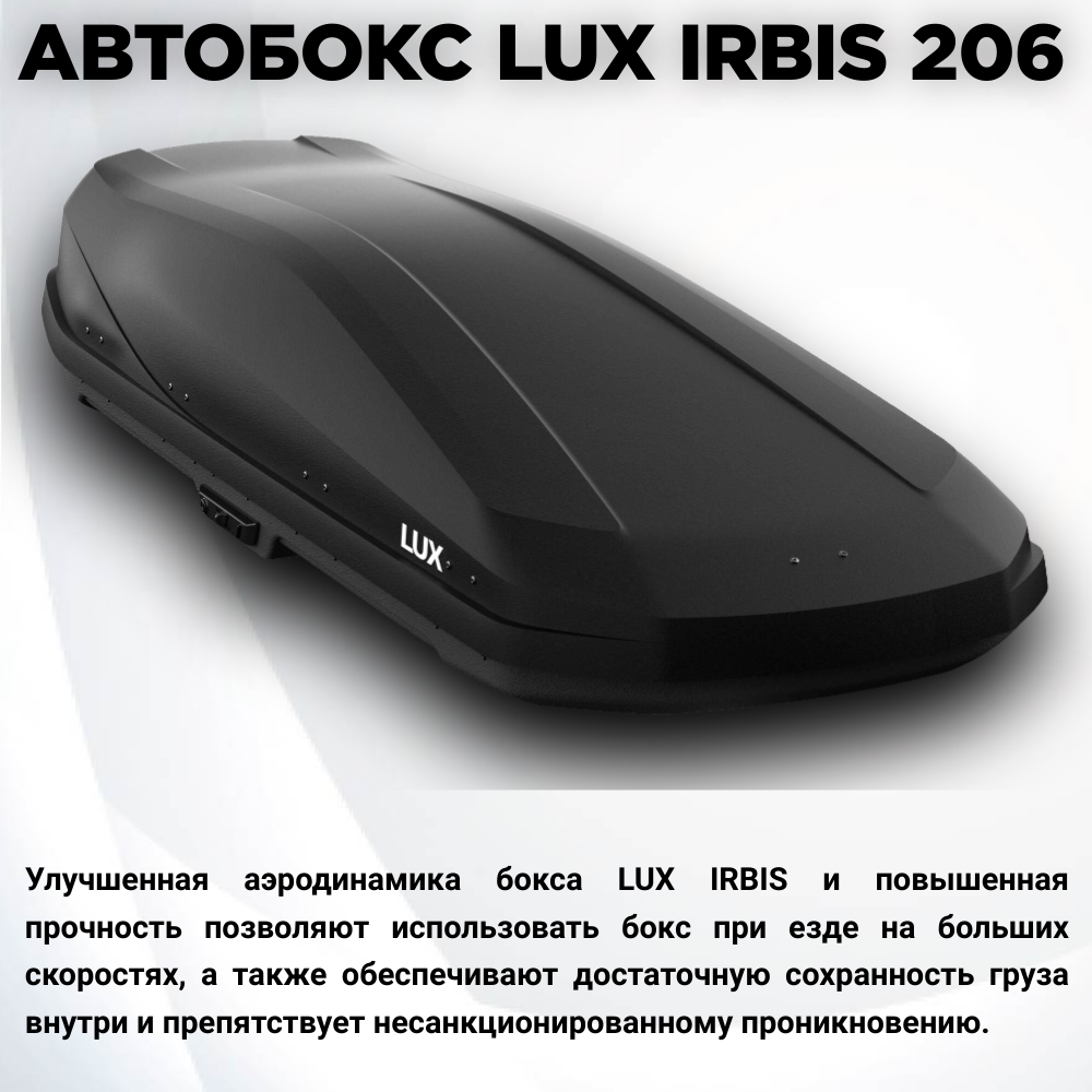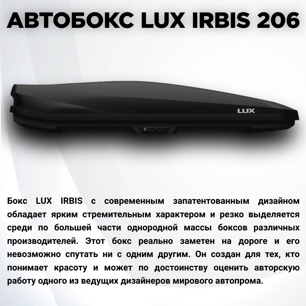 СохранитьАвтобокс на крышу автомобиля LUX IRBIS 206 (Люкс Ирбис 206), черный матовый, 470 литров, с двусторонним открытием, 2060х750х360 мм. (арт. 793488) интересное: