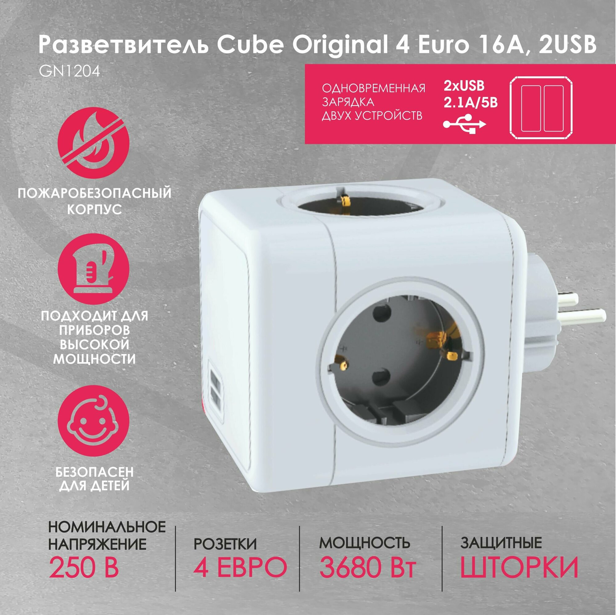 GN1204 Разветвитель Cube Original 4 Euro 16A, 2 USB A с блоком 5В/2.1А RocketSocket, цвет белый-серый Ливолотач