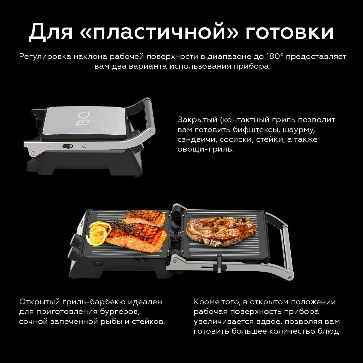Электрогриль BQ GR1002 Черно-серебристый / Мощность 1800 Вт / Антипригарное покрытие / Регулировка температуры