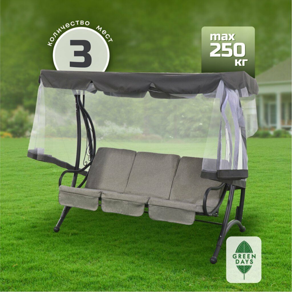 Качели садовые 3-местные, 198х115х176 см, 250 кг, Green Days, с москитной сеткой, серые, рогожка, металл интересное: