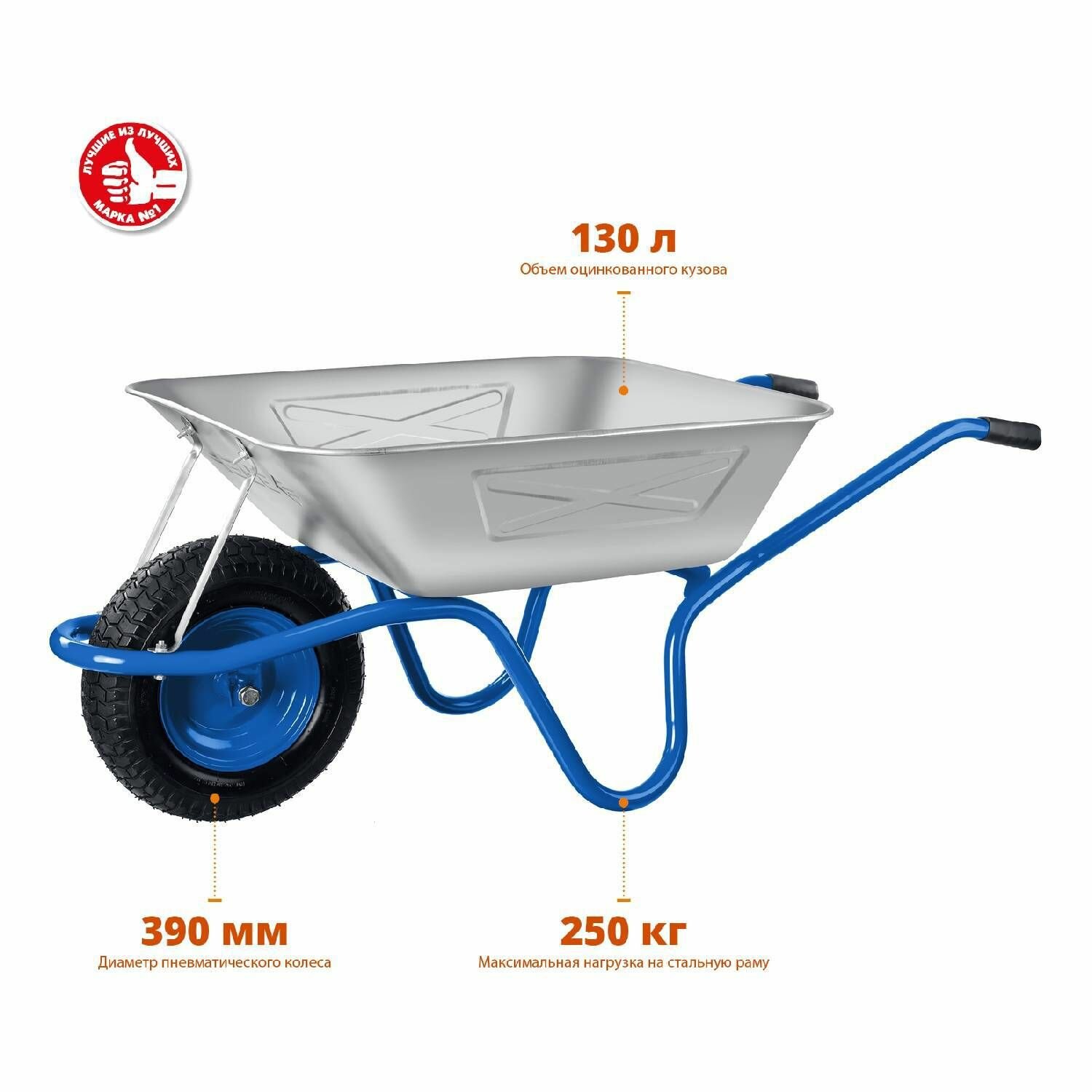 ЗУБР ПТ-250, 130 л, 250 кг, широкое пневматическое колесо, оцинкованная сталь, одноколесная, строительная тачка профессионал (39907)
