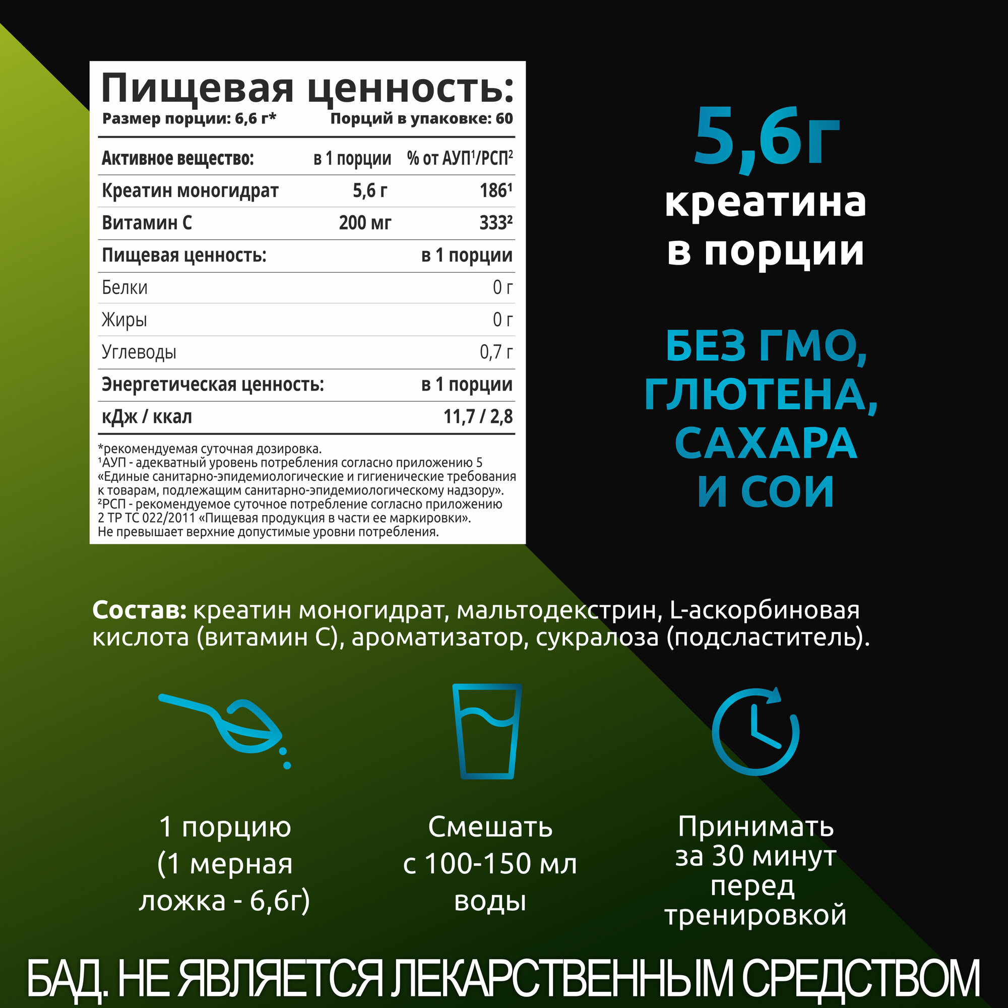 | Дополнительная информация | рекомендации по применению: Рекомендовано принимать по одной мерной ложке (6.6 г), растворив порошок в 250 мл воды, не более двух раз в день. Длительность курса составляет 45-60 дней. Далее можно сделать перерыв в 30-45 дней. Противопоказан людям с непереносимостью любого из компонентов продукта. Не рекомендуется принимать детям до 18 лет, беременным и кормящим женщинам. Перед применением проконсультируйтесь со специалистом.; состав: Креатин моногидрат, мальтодекстрин, лимонная кислота - регулятор кислотности, ароматизатор, диоксид кремния - антислеживающий агент, подсластитель - сукралоза, краситель - зелёное яблоко R100. |