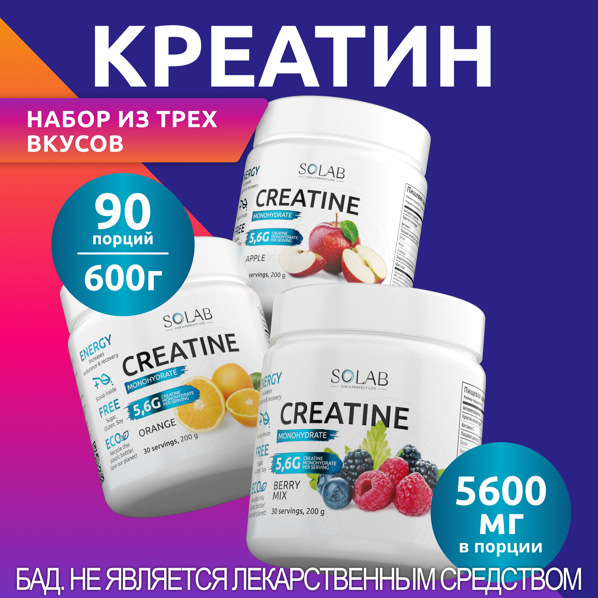 SOLAB Креатин моногидрат порошок, ассорти вкусов, 3 банки по 30 порций