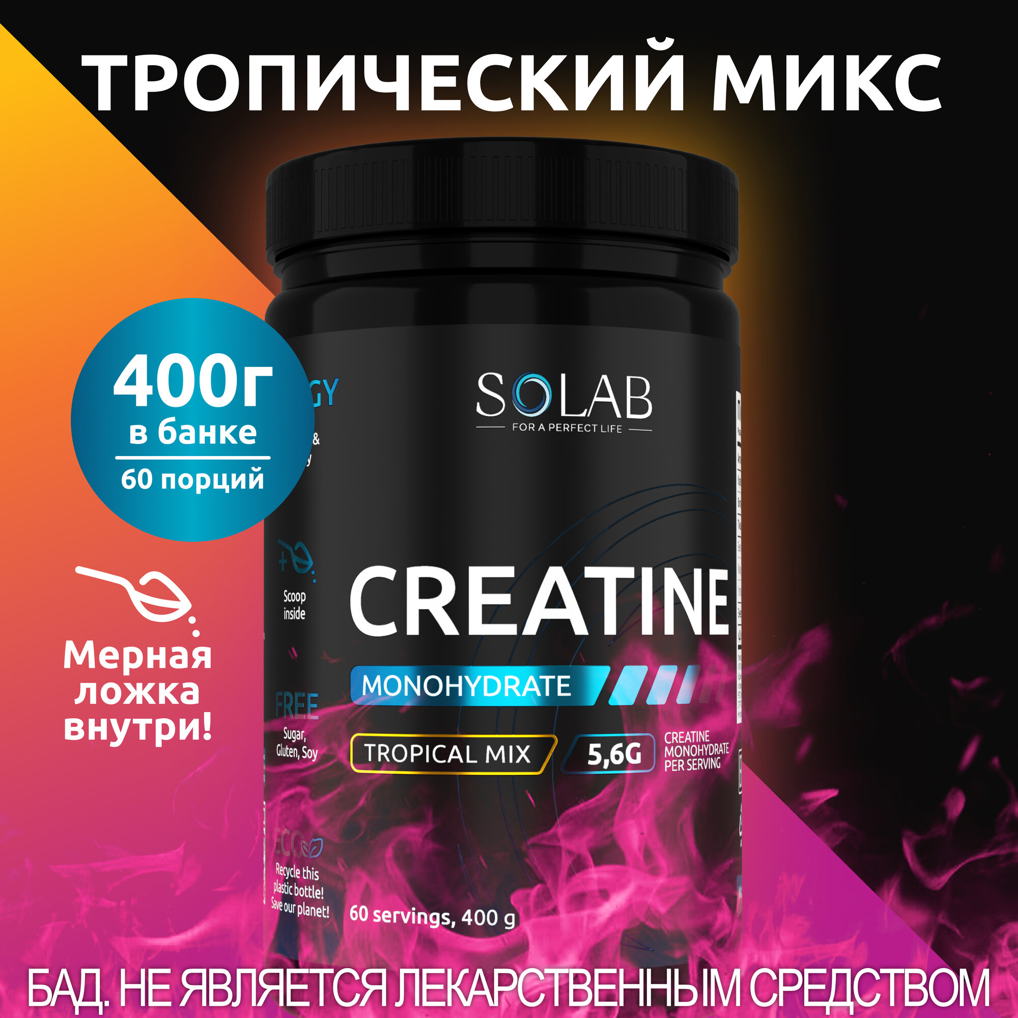 SOLAB Креатин моногидрат порошок 30 порций, Creatine Monohydrate, вкус тропик, 200 гр спортивное питание
