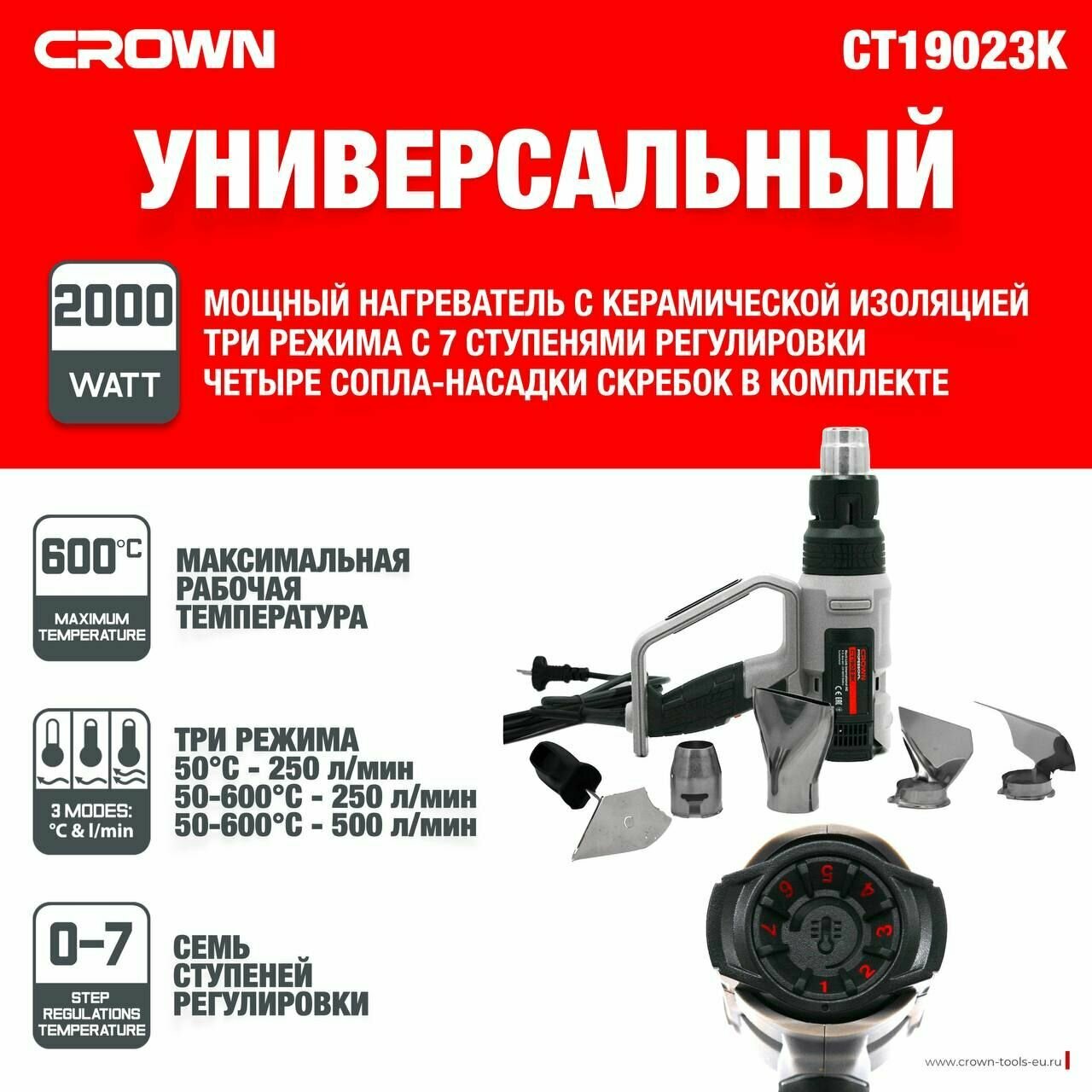 Фен строительный CROWN CT19023K (2000Вт, 3режима, 50-600градС, 250-500л/мин, 0,9кг)