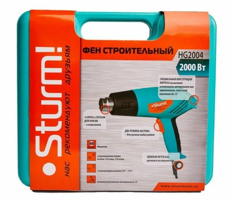 Ниже Вы можете прочитать отзывы на Фен строительный Sturm! HG2004 (2000Вт, 350/550градС, 4 насадки, кейс), ознакомится с подробными характеристиками, посмотреть интересные обзоры и фотографии на Фен строительный Sturm! HG2004 (2000Вт, 350/550градС, 4 насадки, кейс).