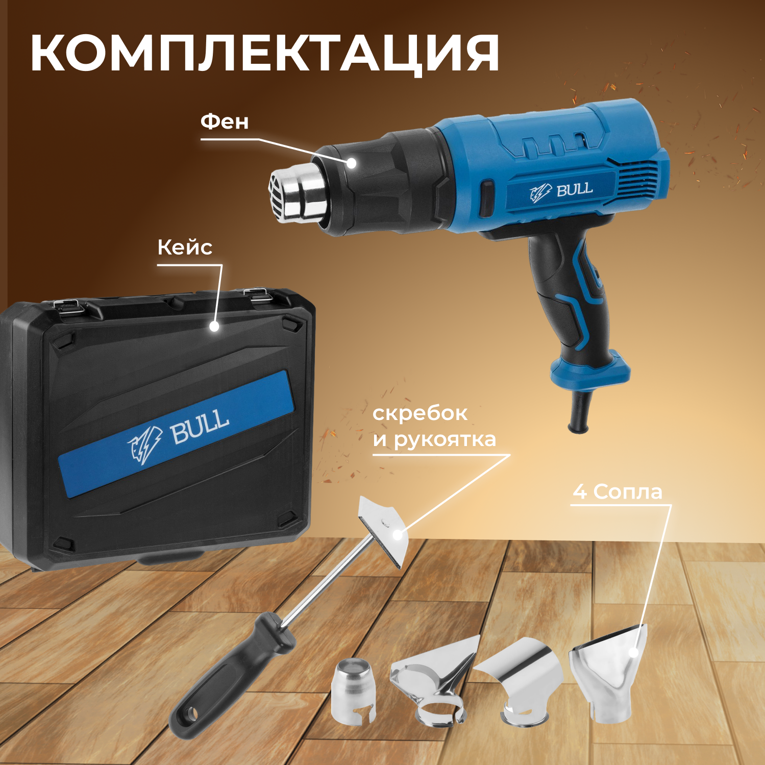 Термовоздуходувка Bull HG 5501 в чемодане + набор сопл