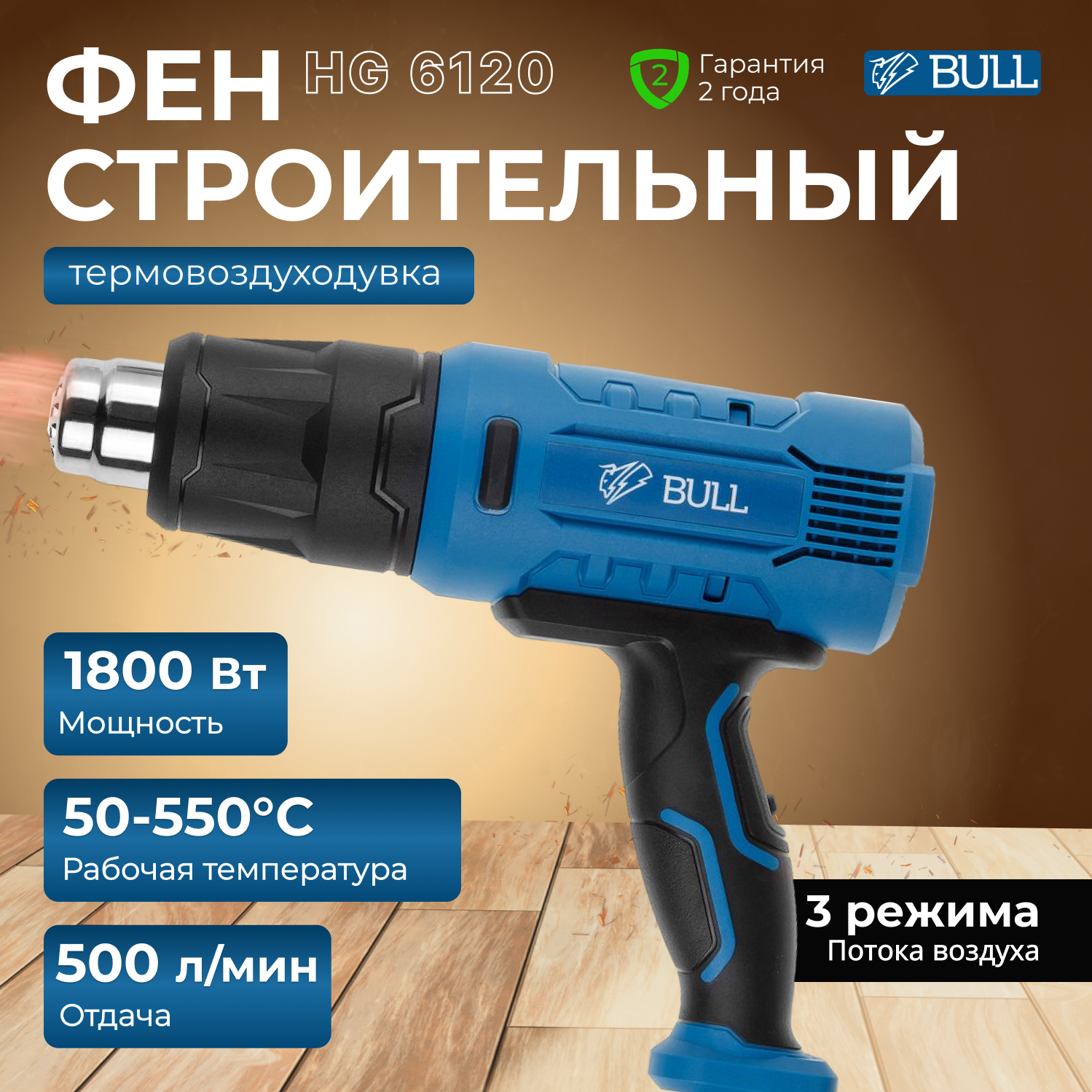 Фен строительный BULL HG 5501 + набор сопл