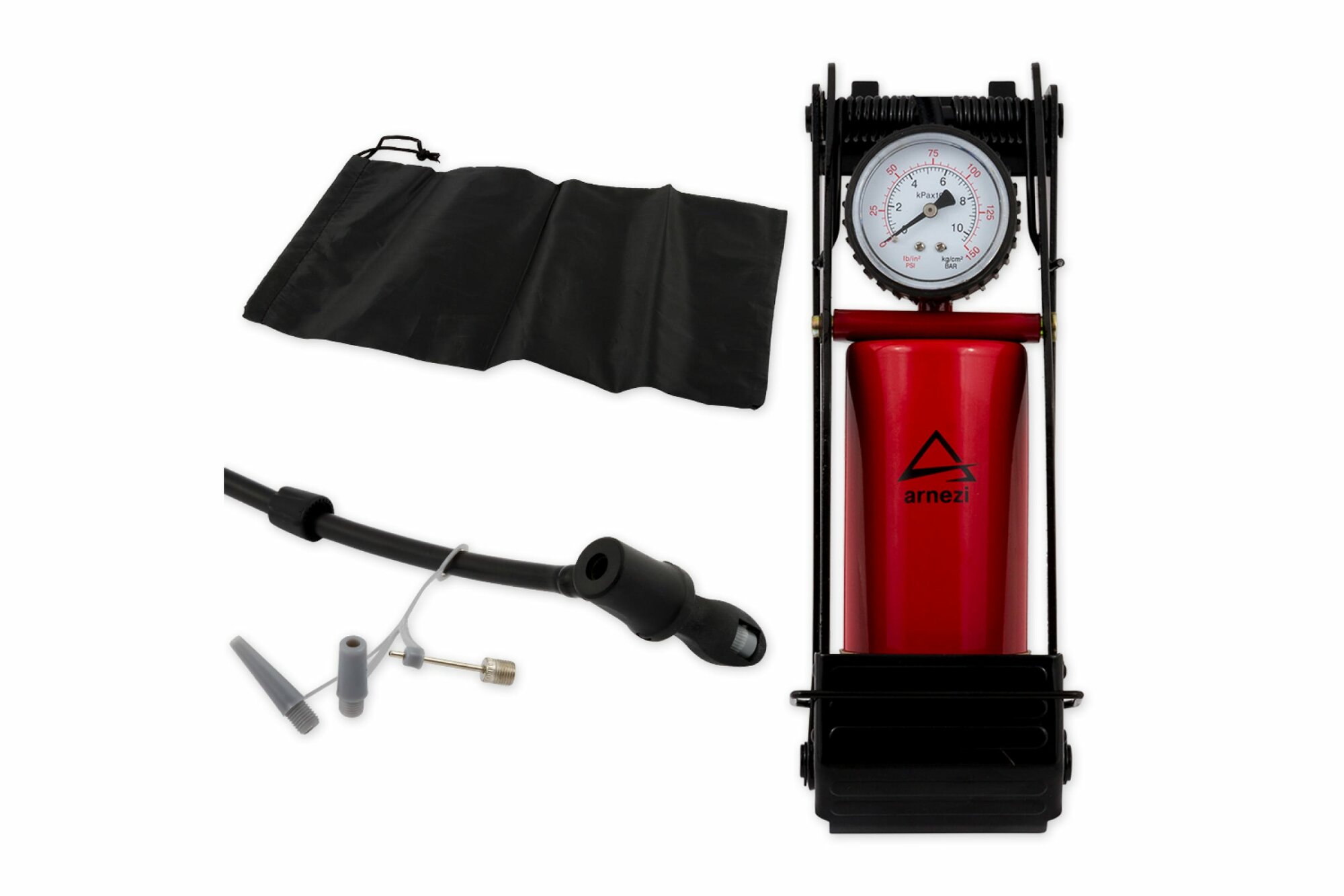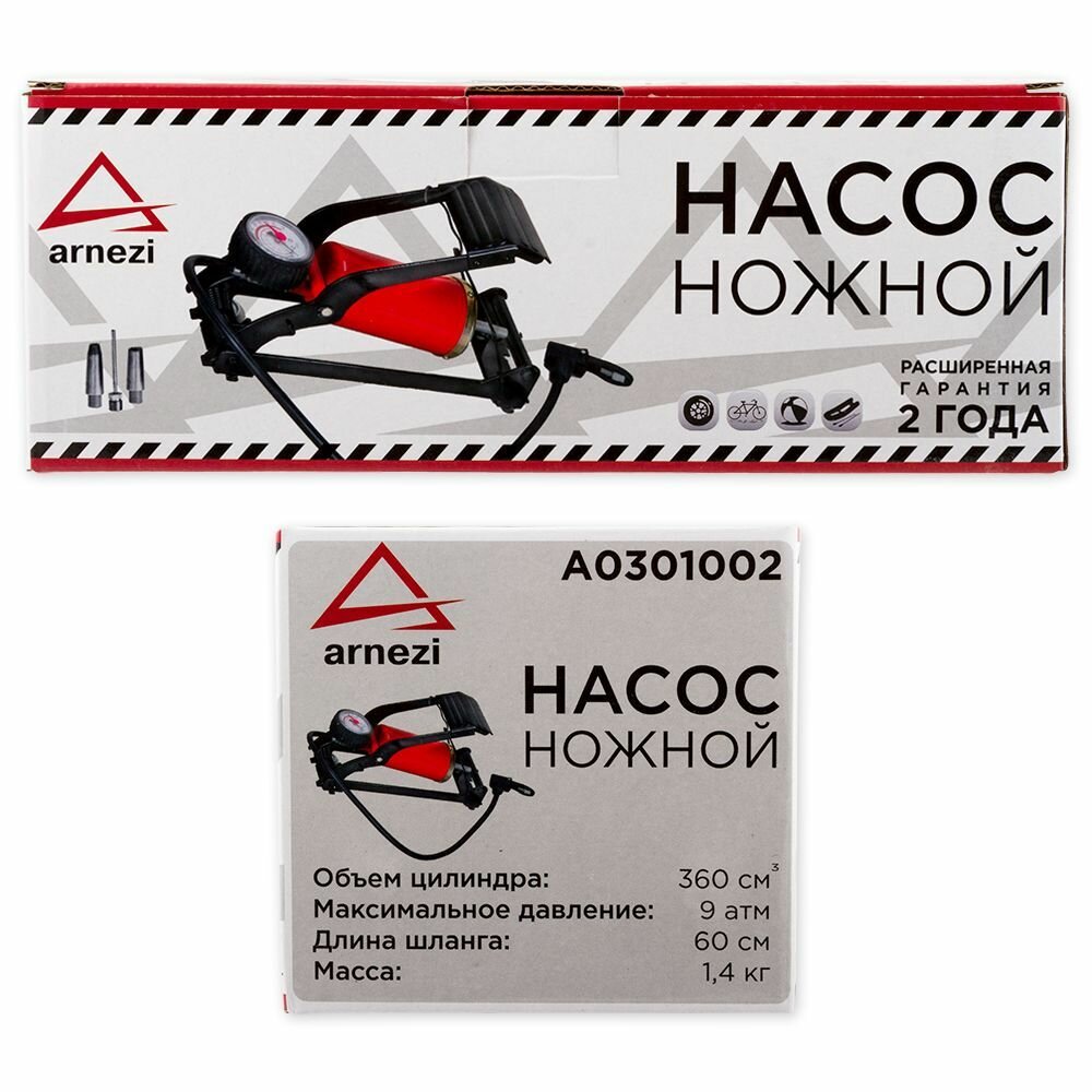 ARNEZI A0301002 Насос воздушный ножной, одноцилиндровый 360 см 3 с манометром 0-9Атм и шлангом L=60 см ARNEZI A0301002