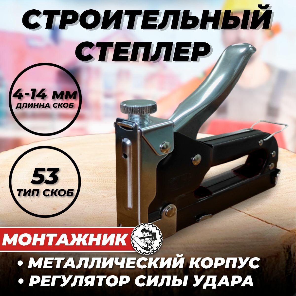 Степлер строительный, пистолет скобозабивной, 4-14 мм (ТИП 53), металлический корпус и регулятор силы удара, Монтажник