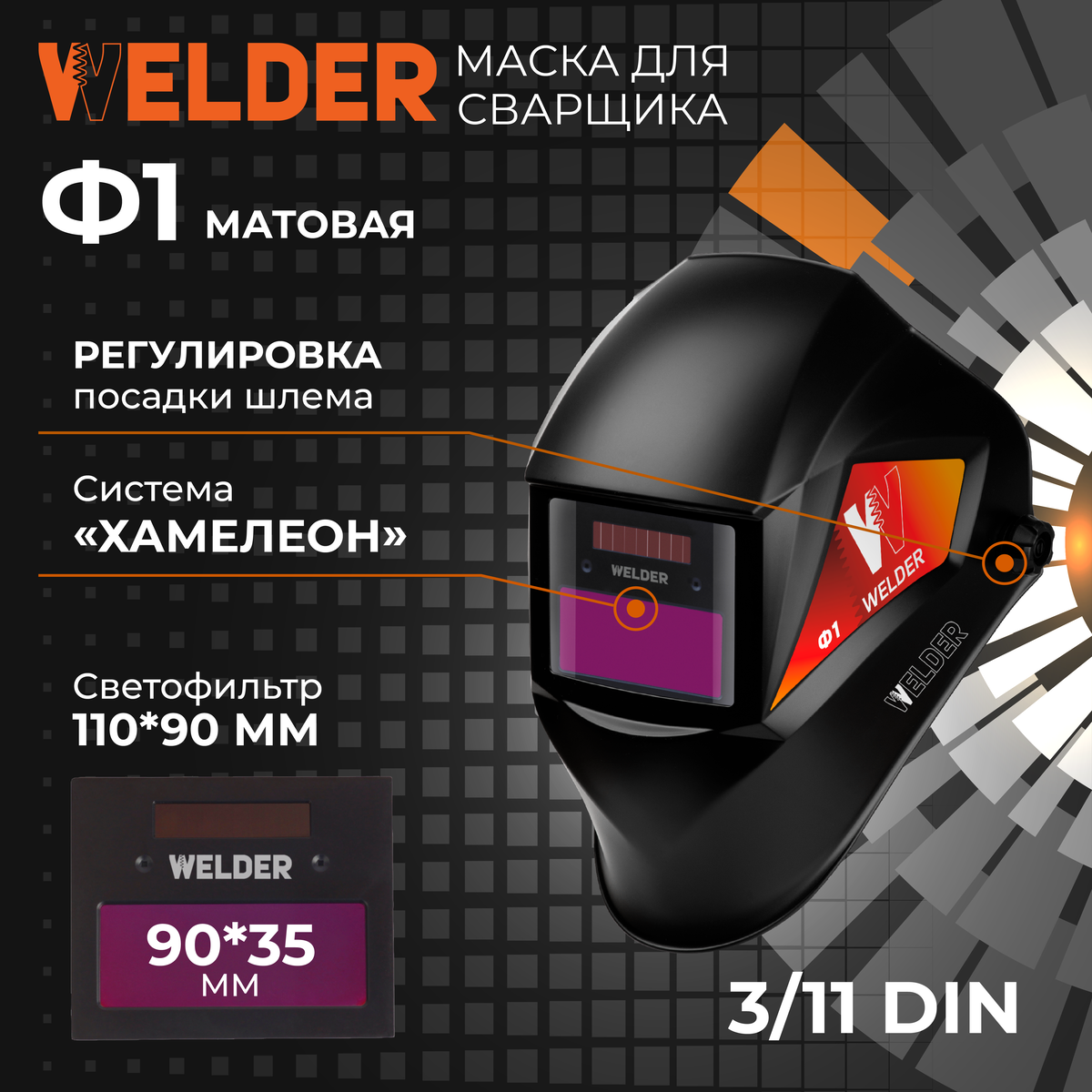 Маска сварочная WELDER PRO Ф1 Хамелеон 90x35 мм, DIN 3/11, матовая, в коробке