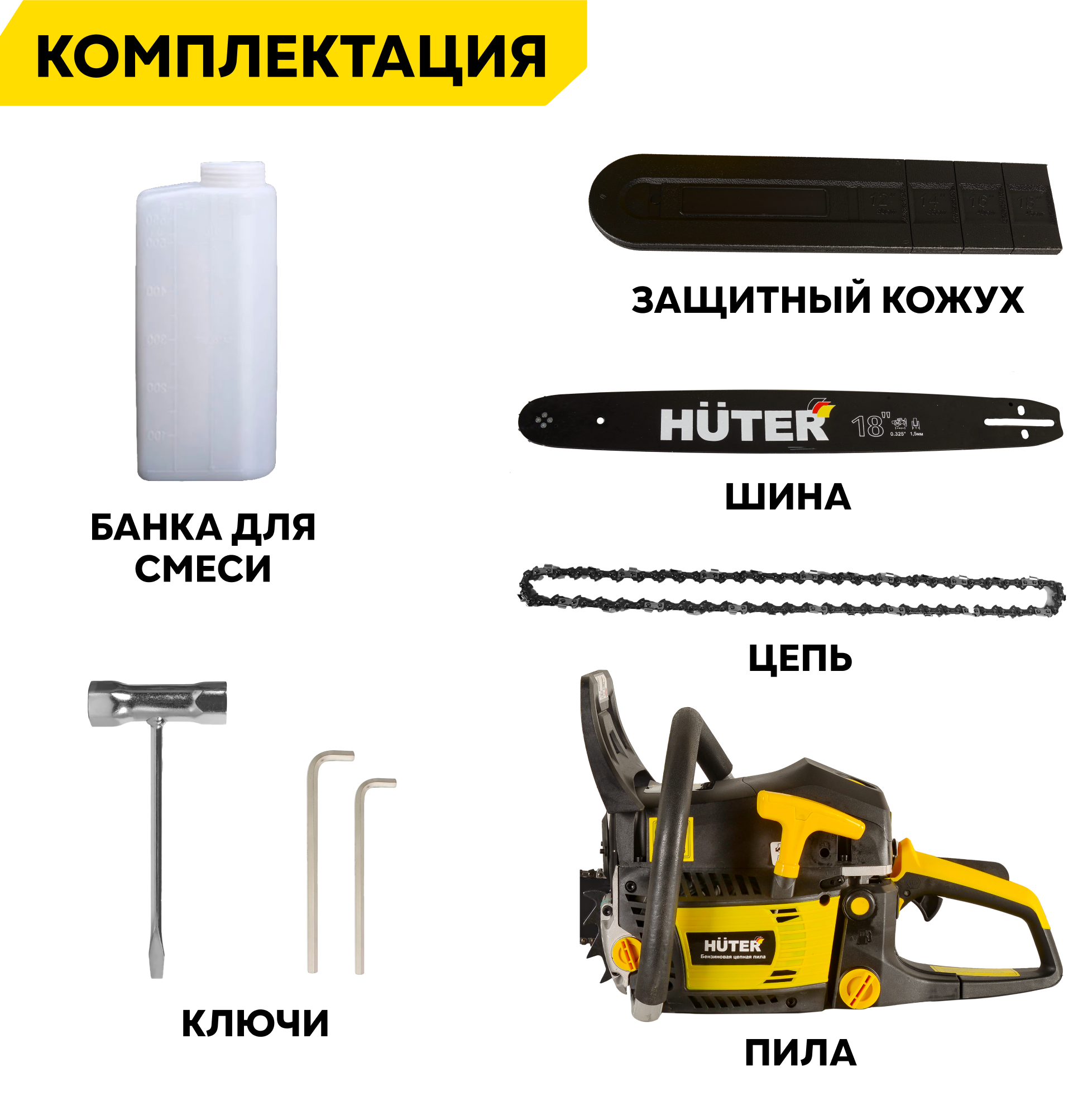 | Комплект поставки | шина, цепь, защитный кожух, зубчатый упор, емкость для смешивания топливной смеси, набор инструментов |