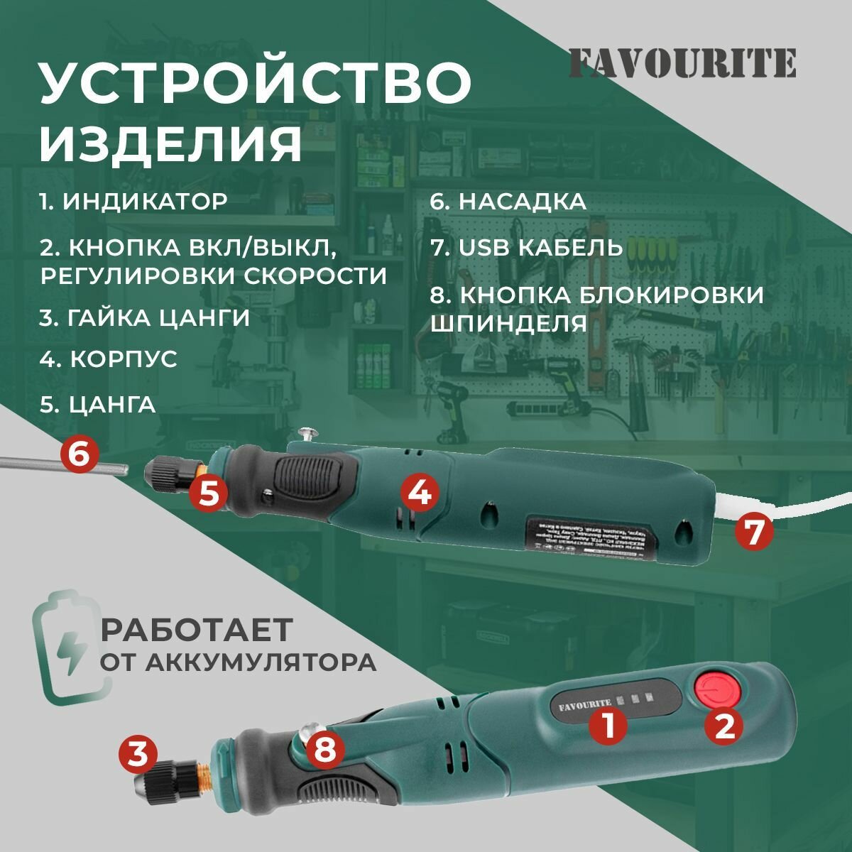 СохранитьГравер аккумуляторный с насадками, шлифовальная машинка FAVOURITE FGM, 3,6 В, 1.3 А/ч, 5000-15000 об/мин, 94 насадки, кейс интересное: